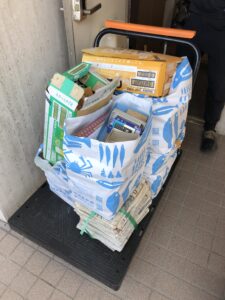 現場はマンションの3階でエレベーターがあったので、台車を使って運んでいきます😊